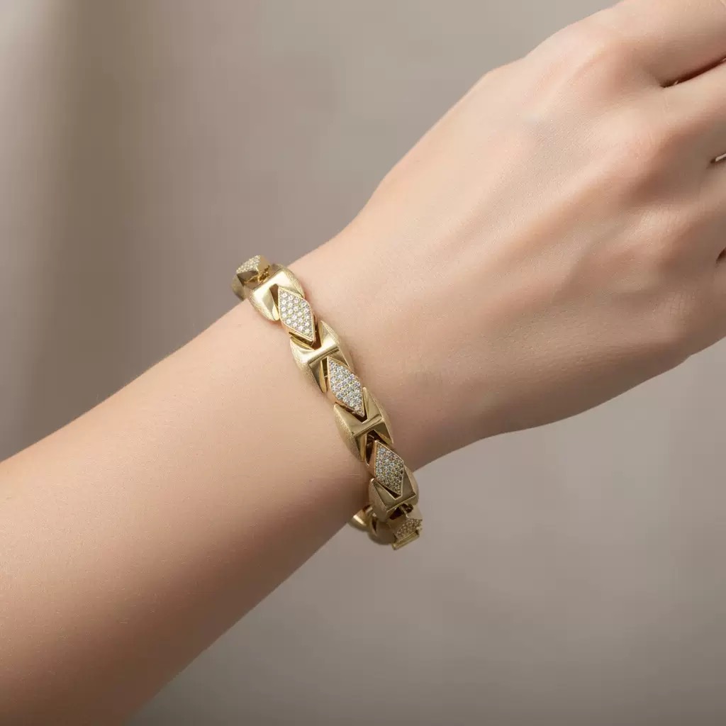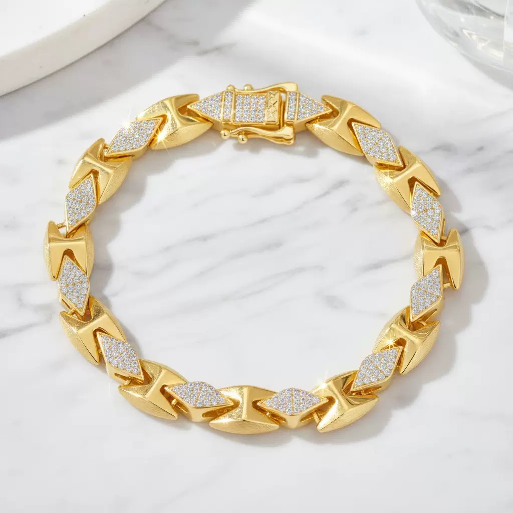 Designed for bold and stylish men, this hip hop inspired bracelet features a luxury gold plated finish with fully paved sparkling moissanite that catches light from every angle. The solid construction ensures long-lasting durability and comfortable daily wear, while the eye-catching design brings a strong sense of personality and bling. Ideal for parties, festivals, and everyday fashion, it is the perfect statement piece to elevate your outfit and show your unique taste.
